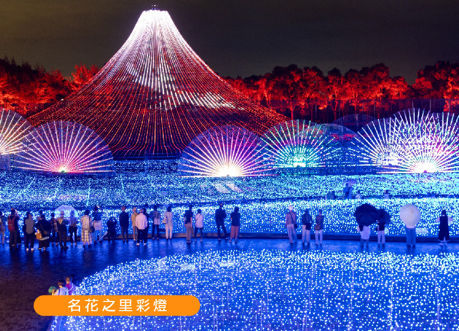 【名花之里光雕藝術燈節】百萬燈海:在三重縣的名花之里為大型花園主題公園,每年冬季、春季會舉辦日本冬季最大、最壯觀的藝術燈節。白天時園內一年四季皆可欣賞到萬紫千紅絢爛的花海,而冬季的燈海最吸引人目光的即是綿延200公尺的光雕隧道,是現今日本人氣的打卡景點,隧道長廊有著不同的顏色,像是春天專屬的粉色燈光所交織而成的櫻花隧道,或是夏季清新的草地綠隧道等。在冬夜裡和您最親愛的親友一同漫步於浪漫的光雕隧道中,欣賞火樹銀花、七彩繽紛的百萬點燈,享受視覺上最震撼的光雕藝術饗宴。