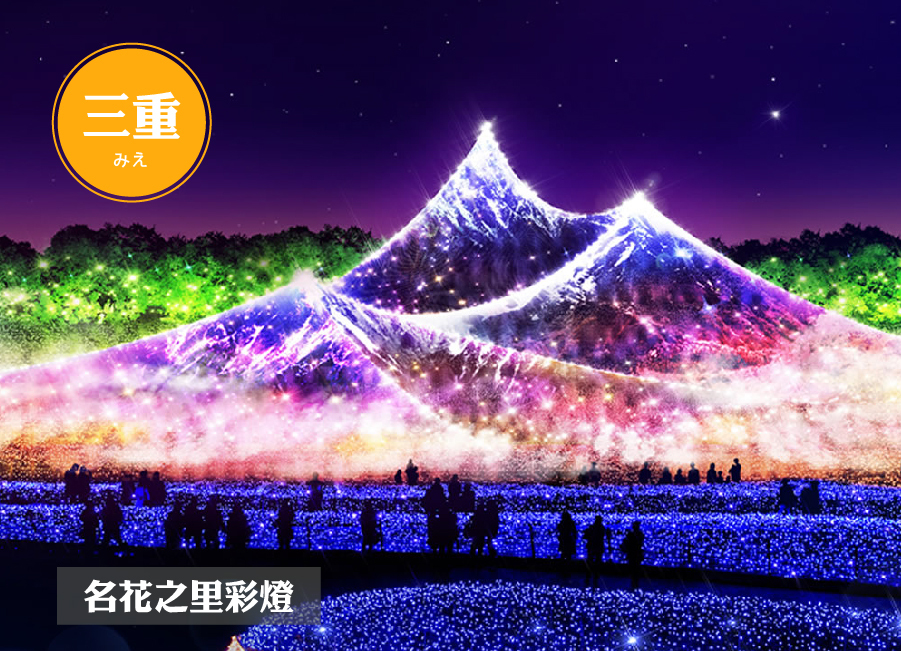 【名花之里燈海】日本最大花卉與燈海交織而成的花園 名花之里四季都盛開著美麗的時令花卉,是日本最大規模的鮮花主題公園。遊客一年四季都能在這裡觀賞到各類花卉。此外還有全年綻放鮮花的大型溫室「秋海棠花園」,這裡能欣賞到白天或夜間都盛開的鮮艷花朵。以冬季為中心日本規模最大且最知名的冬季燈節,由580萬顆LED燈泡裝飾而成點亮寒冷夜晚的天空,營造出浪漫的山、海、花及各種形狀的造型,規模之大令人讚嘆。