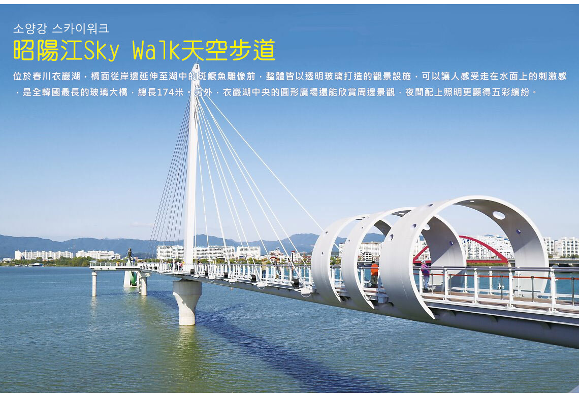 【昭陽江Sky Walk天空步道】位於春川衣巖湖,橋面從岸邊延伸至湖中的斑鱖魚雕像前,整體皆以透明玻璃打造的觀景設施,可以讓人感受走在水面上的刺激感,是全韓國最長的玻璃大橋,總長174米。另外,衣巖湖中央的圓形廣場還能欣賞周邊景觀,夜間配上照明更顯得五彩繽紛。