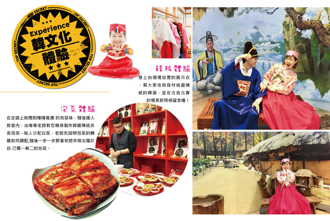 【泡菜文化體驗】由專業老師教您親身製作韓國傳統美食泡菜,老師先說明泡菜的醃醬如何調配,隨後一步一步跟著老師來做出屬於自己獨一無二的泡菜。隨後穿上由現場放置的展示衣,幫大家依照身材挑選傳統的韓服,並在古色古香的場景前照相留念喔!