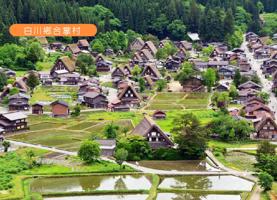 【白川鄉合掌村】約有200~300年前所留的合掌式造作建築,地處豪雪地帶、再加上山區地形阻絕、形成地域獨特的文化風俗,至今仍完整保留為日常生活之用,其中以合掌形的茅草家屋最為著名,為防積雪而建構得急斜面的茅草屋頂,有如兩手合掌的形狀,目前尚有113棟,屋旁田地園圃交錯銜接,構成一幅濃厚懷古幽情、山間農村的田園景觀,於1995年12月聯合國文教組織登錄為世界遺產以來,世界各國的觀光客蜂擁而至,而此地可了解文化歷史背景來源。