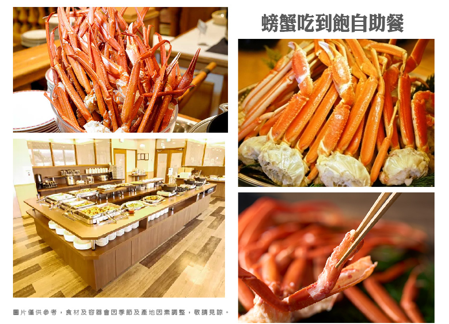 | 早餐 :飯店內享用 | 午餐 :涮涮鍋吃到飽+飲料無限暢飲¥2500 | 晚餐 :飯店內自助餐(住宿萬座王子品嘗螃蟹吃到飽) |