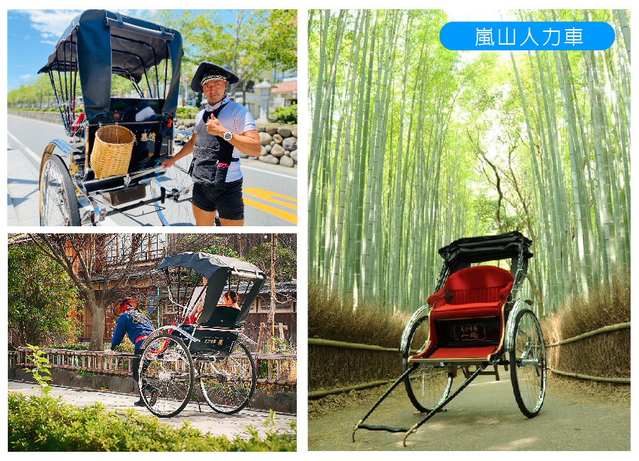 搭乘人力車穿梭於嵯峨野的竹林間,是極受歡迎的路線。 這條路線很好地結合了竹林和渡月橋的景色,竹林和渡月橋已經成為嵐山觀光的主要景點,而渡月橋地區的僻靜小巷則讓人感受到寧靜的氣氛。