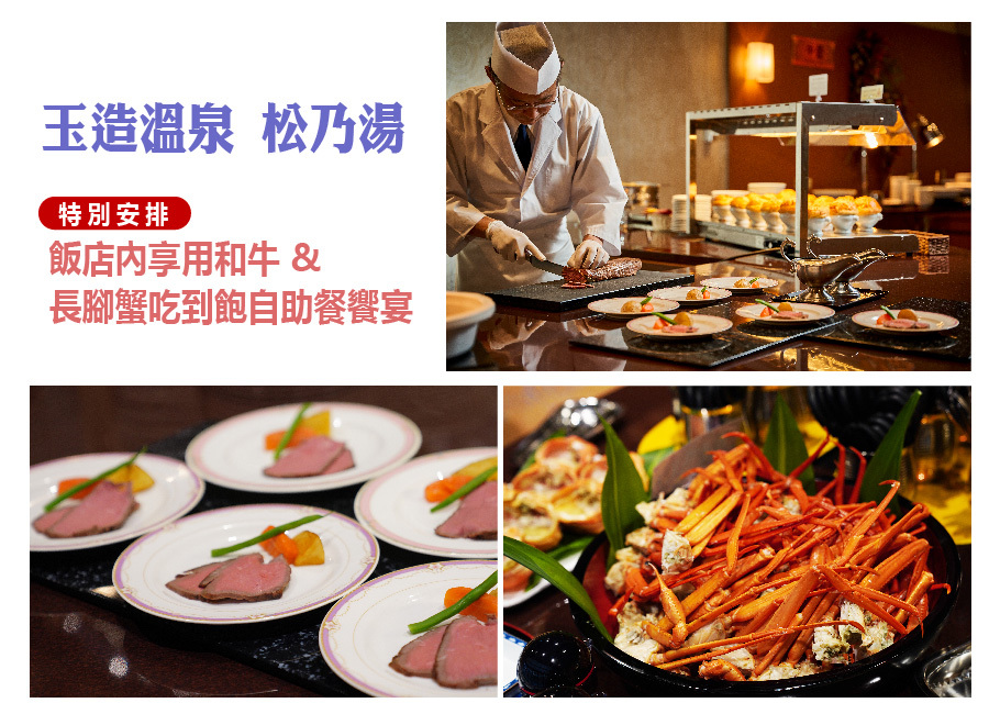 | 早餐 :溫暖的家 | 午餐 :機上精緻餐食 | 晚餐 :飯店內享用百匯自助餐 或 會席料理 |
