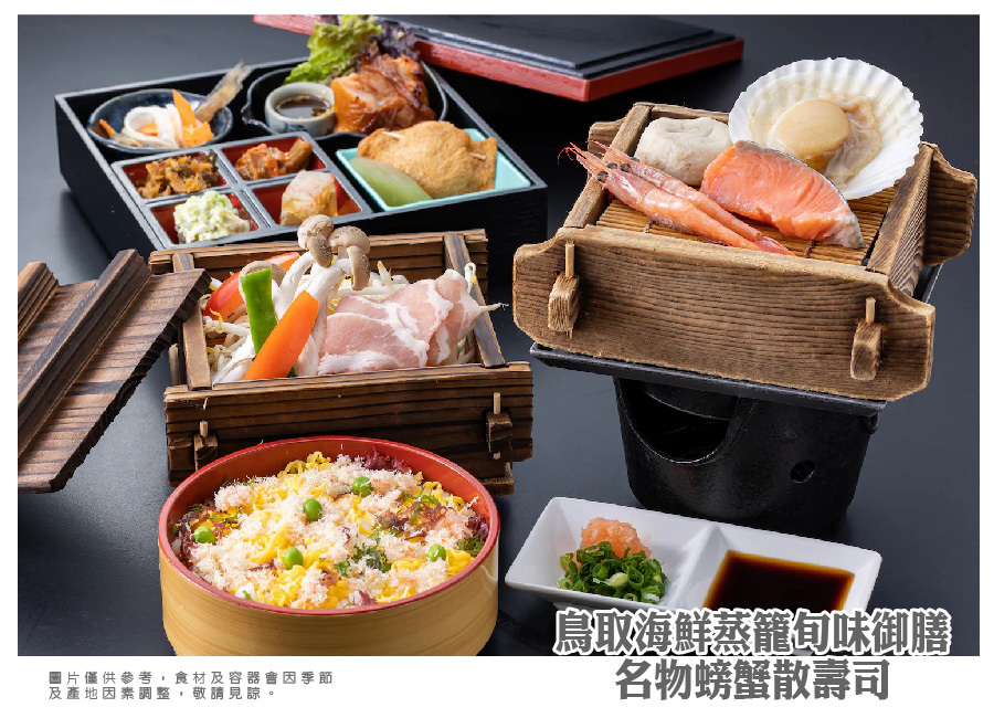 | 早餐 :飯店內享用 | 午餐 :鳥取螃蟹散壽司&煙燻蒸籠御膳¥2000 | 晚餐 :飯店內百匯自助餐 或 迎賓會席料理 或 飯店外享用精選日式旬味御膳 |
