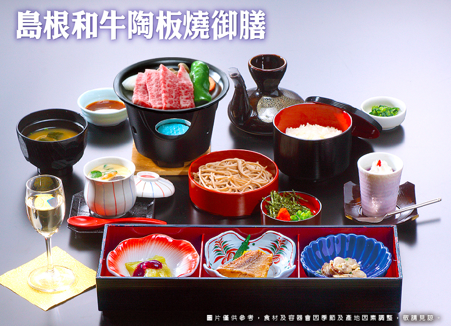 | 早餐:飯店內享用 | 午餐 :★特別安排 島根和牛精選陶板御膳[(季節前菜.島根和牛陶板燒.島根割子蕎麥麵.茶碗蒸.甜點) ¥2500 | 晚餐 :★特別安排飯店內享用和牛長腳蟹吃到飽自助餐饗宴 |