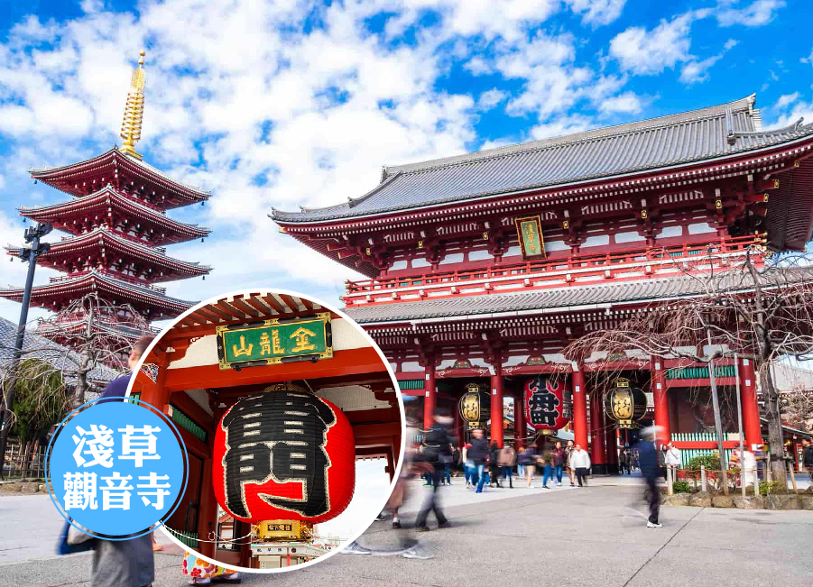 【淺草觀音寺(風雷神門)】淺草觀音寺(風雷神門)、仲見世街 淺草觀音寺(風雷神門)、仲見世街 為日本觀音寺總堂。相傳在古天皇36年3月18日SUMIDA川的三位漁民在出海捕魚時,看到觀音顯現,於是那時的漁民回去將此事說出來以後,信觀音的人日益增多,並建立淺草寺來供奉觀音,來到這裡您當然也不能錯過長達百公尺販售各式各樣精美紀念品及美味仙貝的仲見世街。
