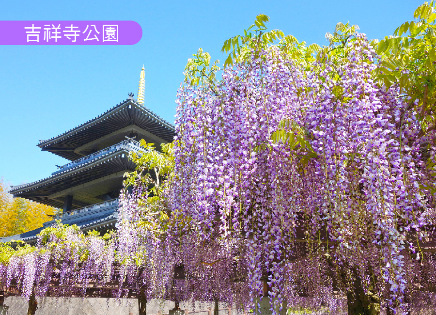 【吉祥寺公園】樹齡超過150年的大藤樹,將吉祥寺境內染上一片夢幻的白紫色。可從高台俯瞰藤棚與八幡市與其他賞藤點會有截然不同的美感,花季期間,吉祥寺周邊也有包含吉祥太鼓等許多活動和攤販,令當地變得相當熱鬧。