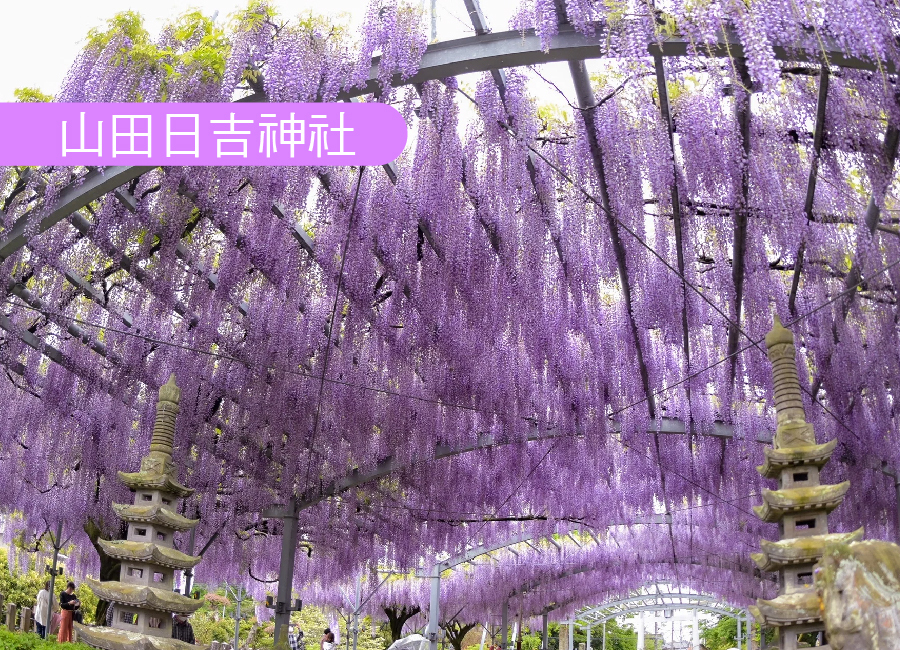 【山田日吉神社】神社境內有一株樹齡約200年的山田之藤,是熊本縣最大的紫藤,也是熊本縣指定天然紀念物。藤花棚架像一個大型拱門覆蓋在神社參道上,盛開的紫藤花可長達1公尺,漫步在藤架下,彷彿被夢幻的紫藤花瀑圍繞,讓人感受到春天的浪漫氣息。