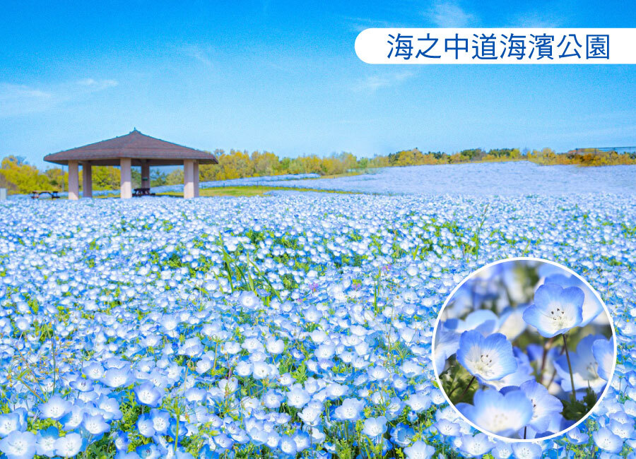 【海之中道海濱公園】位於福岡的北方的一個狹長沙洲半島之上,公園佔地近300公頃,規劃了花卉區、兒童遊戲區、動物區,花卉區放眼望去這裡充滿了草原跟四季不停變換的花海,春季油菜花、初夏和秋季有玫瑰節、秋冬有大波斯菊、波波草等。福岡市民更常於此騎腳踏車運動、划船、烤肉,或是空著手前來也能享受悠閒的歡樂時光。