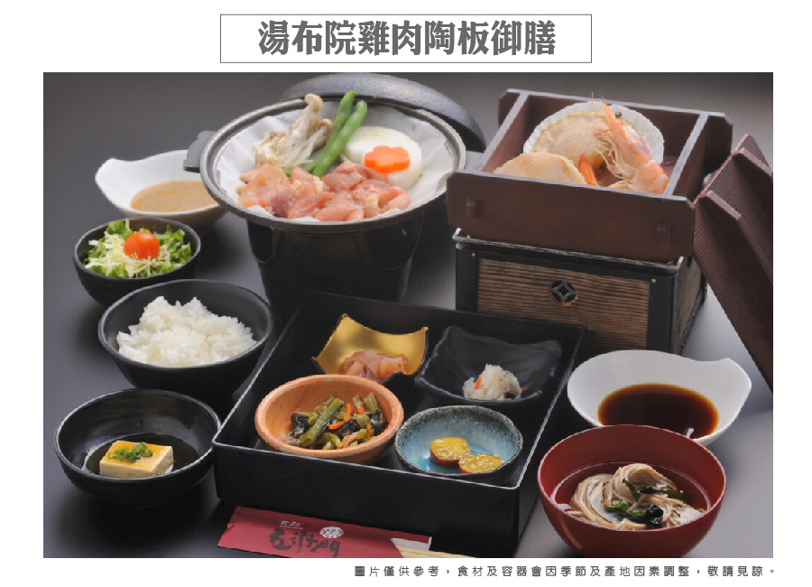 | 早餐 :飯店內享用 | 午餐 :湯布院蒸籠季節套餐或湯布院季節料理¥2500 | 晚餐 :飯店內自助餐 或 會席料理 |