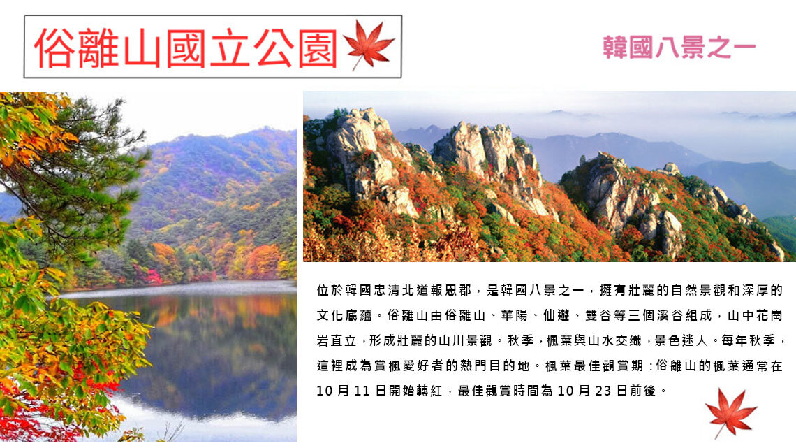 【俗離山國立公園(賞楓)】位於韓國忠清北道報恩郡,是韓國八景之一,擁有壯麗的自然景觀和深厚的文化底蘊。俗離山由俗離山、華陽、仙遊、雙谷等三個溪谷組成,山中花崗岩直立,形成壯麗的山川景觀。秋季,楓葉與山水交織,景色迷人。 每年秋季,這裡成為賞楓愛好者的熱門目的地。楓葉最佳觀賞期:俗離山的楓葉通常在10月11日開始轉紅,最佳觀賞時間為10月23日前後。
