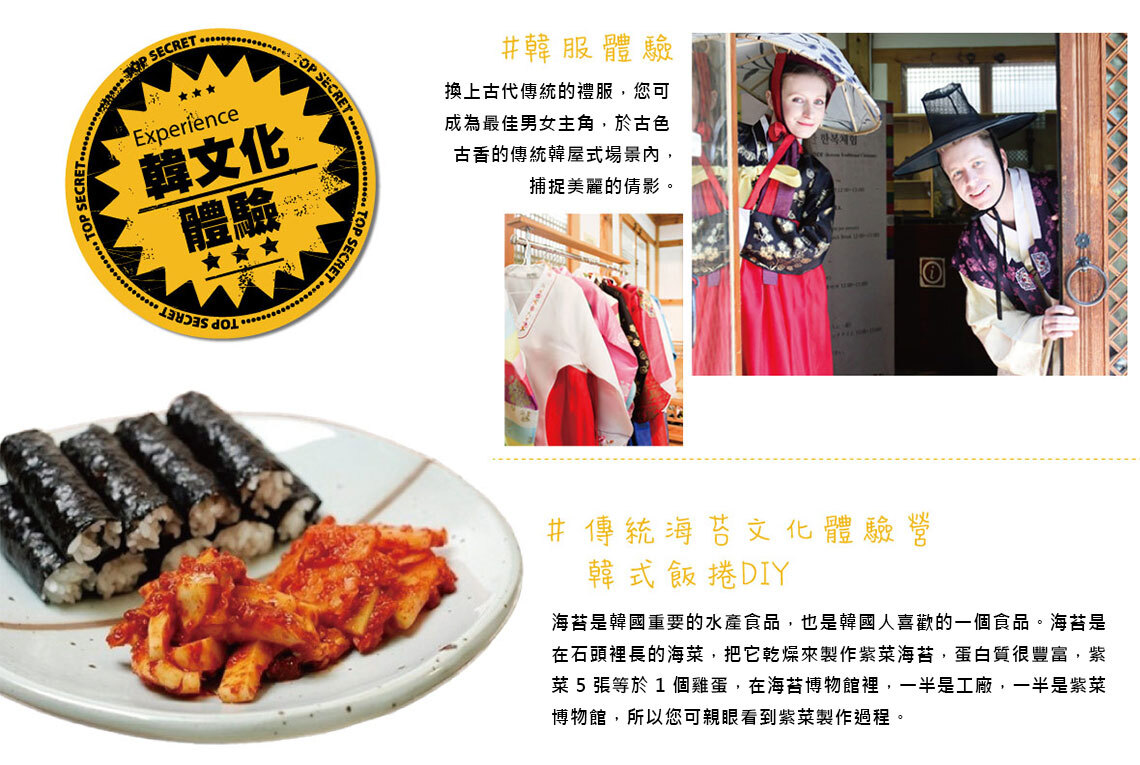【韓國傳統美食體驗館(海苔飯捲DIY+韓服體驗)】海苔是韓國重要的水產食品,也是韓國人喜歡的一個食品。海苔是在石頭裡長的海菜,把它乾燥來製作紫菜海苔,蛋白質很豐富,紫菜5張等於1個雞蛋,在海苔博物館裡,一半是工廠,一半是紫菜博物館,所以您可親眼看到紫菜製作過程。換上古代傳統的禮服,您可成為最佳男女主角,於古色古香的傳統韓屋式場景內,捕捉美麗的倩影。