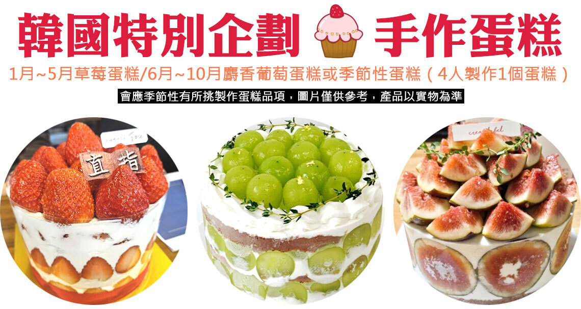【韓國特別企劃手作蛋糕】手作水果蛋糕DIY+1杯飲品:1月~5月草莓蛋糕/6月~10月麝香葡萄蛋糕或季節性蛋糕(4人製作1個蛋糕)