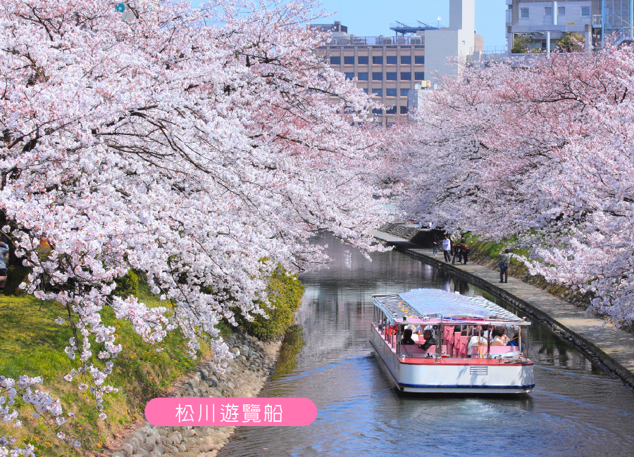 【松川】松川為琵琶湖支流流經富山城跡舊址是當地居民的休憩場所,河川兩旁種滿500棵以上的櫻花樹,因松川河道寬度較窄小,兩旁盡情伸展的櫻花樹稍互相交錯,成為一夢幻天幕,而被選為「日本櫻花名勝景點百選」之一。搭乘松川穿梭於粉紅天幕之下,讓眼前視線僅有粉嫩花海,宛若進入世外桃源。