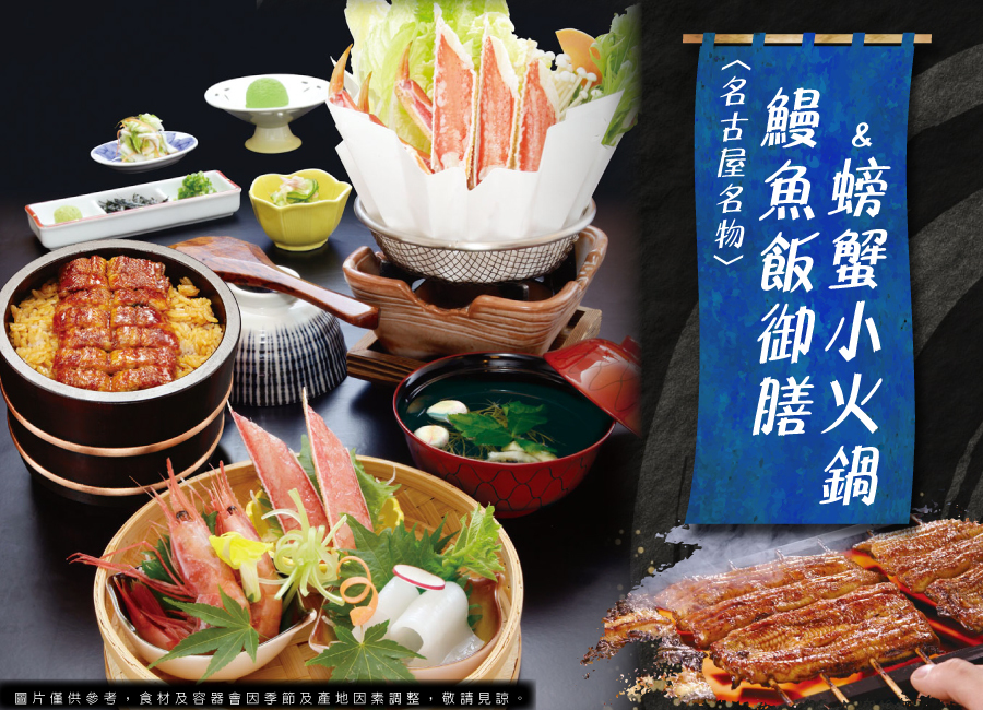 | 早餐:飯店內享用 | 午餐 :日式風味御膳 或 日式藥膳涮涮鍋¥3000 | 晚餐 :名古屋名物鰻魚飯御膳+螃蟹小火鍋¥5500 |