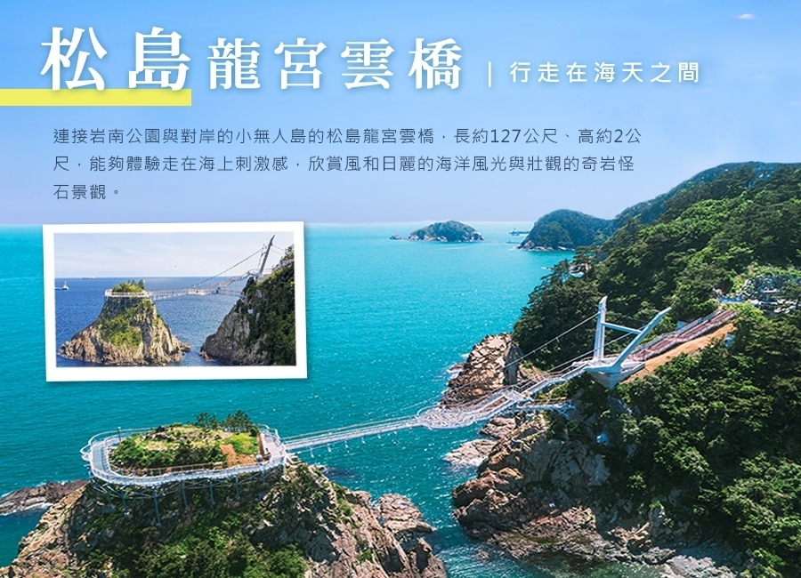 【韓國觀光100選~超夯打卡祕境~360度絕美「松島龍宮雲橋」】釜山松島龍宮雲橋是連接岩南公園與無人島東島的海上景觀橋,全長約127公尺,橋身為鐵網結構,遊客可從橋上觀賞奇岩、碧綠海水與壯麗海景,並眺望南港大橋、釜山塔等景點,是釜松島的四大名勝之一