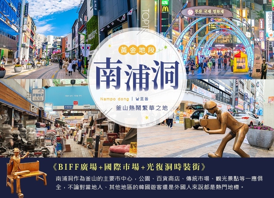【南浦洞國際市場(光復洞時裝街、BIFF國際電影廣場)】釜山南浦洞的國際市場(Gukje Market)是一個歷史悠久的傳統市場,始於1950年代的韓戰時期,當時是難民聚集交易的場所,至今已發展成一個綜合性的購物天堂,商品種類包羅萬象,從服飾、生活用品到韓國特色伴手禮無所不賣。。