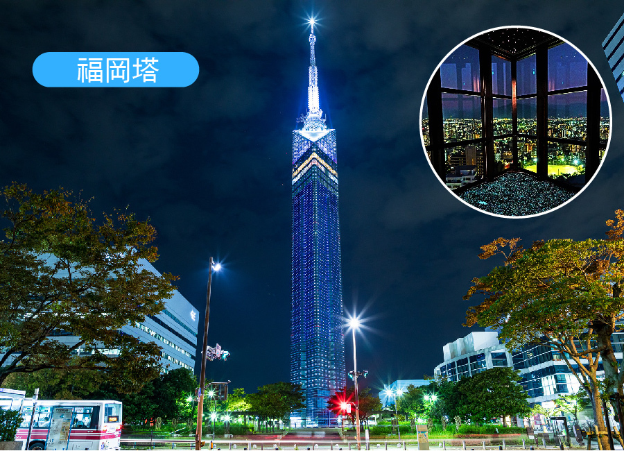 【福岡塔】為紀念於1989年舉行的「亞洲太平洋博覽會」而建,是福岡市的地標建築。塔高234公尺,塔的頂樓觀景臺能以360度全景角度眺望福岡市街景。塔內設有VR雙眼望遠鏡能給人宛如在空中飛翔的感受,塔內2樓有高120公尺景觀的「空中咖啡廳&餐廳 Refuge」,店內整片大面落地窗宛如置身空中庭園,是熱門的約會景點。