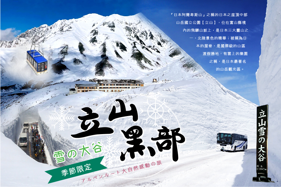 『日本阿爾卑斯山』之稱的日本之座頂中部山岳國立公園【立山】,位在富山縣境內的飛驒山脈上,是日本三大靈山之一,北陸景色的精華;被稱為日本的屋脊,是國際級的山區渡假勝地,有雲上的樂園之稱,是日本最著名的山岳觀光區。因位於海拔二千多公尺,冬季積雪太深無法通車,每年四月下旬至十一月中下旬才可全線行車。 每當四月開始通車之前,雪車在積雪中挖出一條雪道,穿越兩旁二十公尺高十分壯觀的雪壁,震懾之餘,也感受到另一種自然之美。夾在立山連峰之間的黑部峽谷,仍保留在原始環境之中的天然峽谷,有豐富的自然景觀和資源。 春天有高達18公尺的巨大雪壁,形成氣勢磅礡的雪谷世界;夏季層巒聳翠、消暑養眼;秋天則見遍野楓紅;與峰頂初雪輝映的絕佳景緻。 藉由不同交通工具(空中纜車、高原巴士、隧道巴士、登山電車)等,讓您輕鬆翻山越嶺,飽覽高山狹谷之景,瀑布溪流之美,還有人工水壩的宏偉壯觀。