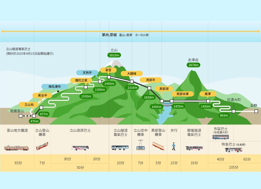 【參考行車時間】金澤或富山→(約1時)立⼭⾞站→(立⼭纜⾞:約1.3公⾥7分鐘)→美女平→(立⼭⾼原巴⼠:約23公⾥50分鐘)→室堂→(立⼭隧道無軌電⾞:約10分鐘3.7公⾥)→⼤觀峰→(立⼭空中纜⾞:1.7公⾥7分鐘)→⿊部平→(⿊部纜車:0.8公⾥5分鐘)→⿊部湖→(散步過去)→⿊部⽔壩→(關電隧道電氣巴士:6.1公⾥15分鐘)→扇澤⾞站→(約1時)長野縣