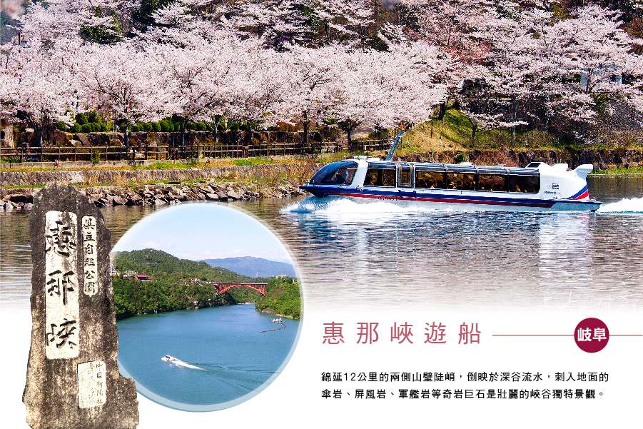 【惠那峽遊船】惠那峽位於岐阜縣惠那市,是受大自然侵蝕而形成的斷崖絕壁,綿延12公里的兩側山壁陡峭,倒映於深谷流水,是難得一見的美景,猶如刺入地面的傘岩、屏風岩、軍艦岩等奇岩巨石是這裡的特色,可搭乘遊覽船欣賞。遊覽過程之中,可以透過窗子盡情欣賞惠那峽迷人的景色,特別是春季櫻花盛放,而秋季的楓紅也令人屏息,每到觀賞時期,都會引來眾多遊客前來一看這美不勝收的景色。