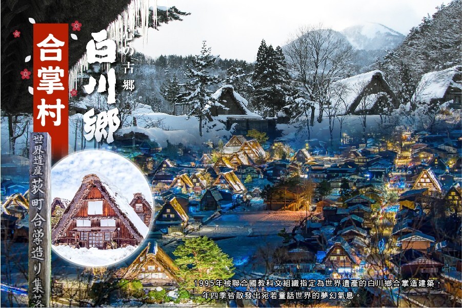 【白川鄉合掌村】約有200~300年前所留的合掌式造作建築,地處豪雪地帶、再加上山區地形阻絕、形成地域獨特的文化風俗,至今仍完整保留為日常生活之用,其中以合掌形的茅草家屋最為著名,為防積雪而建構得急斜面的茅草屋頂,有如兩手合掌的形狀,目前尚有113棟,屋旁田地園圃交錯銜接,構成一幅濃厚懷古幽情、山間農村的田園景觀,於1995年12月聯合國文教組織登錄為世界遺產以來,世界各國的觀光客蜂擁而至,而此地可了解文化歷史背景來源。