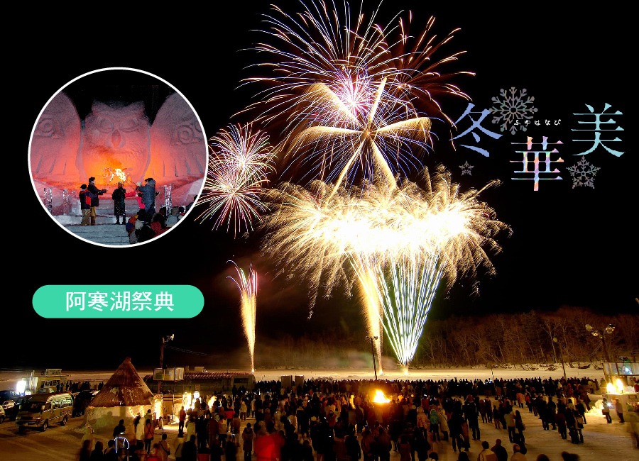 【阿寒湖祭典「冬華美」】夜間您可自行前往體驗期間限定冬祭典:阿寒湖祭典「冬華美」 (2026年2月1日~3月2日) 於阿寒湖上空澄澈的夜空打上煙火,除了許多大型雪雕,還有各種體驗活動,現場並販賣現炸若鷺魚天婦羅及熱牛奶等。晚間前往敬請注意自身安全。