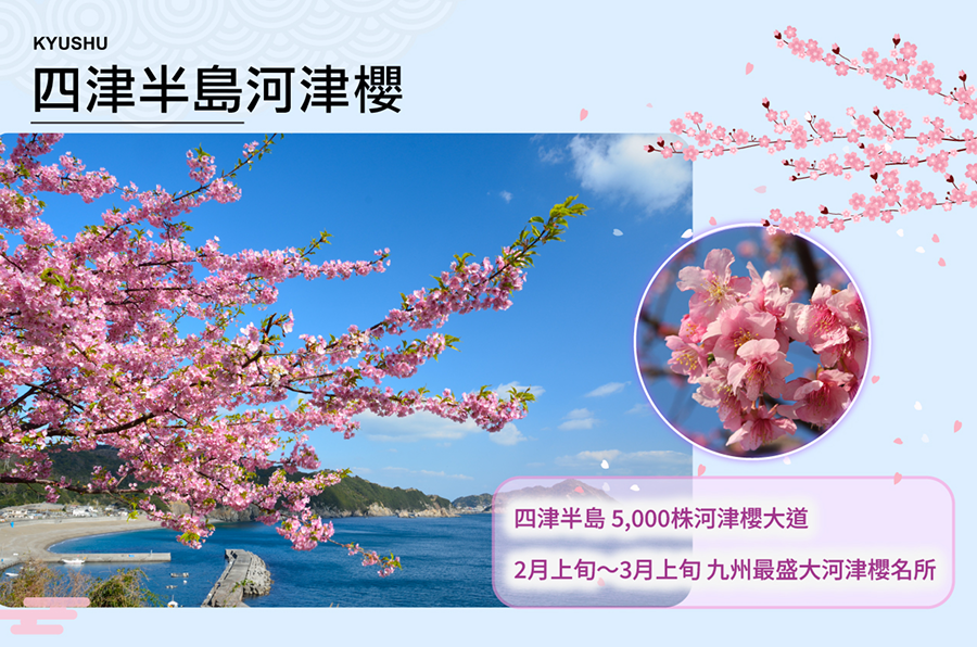 【四津半島河津櫻】 大分縣東南部的「津久見市」是九州最早迎接春天的賞櫻名所,這裡為面朝豐後水道的沿海城市,氣候較為溫暖,河津櫻於2月上旬便會陸續綻放。四浦半島約有5,000棵河津櫻分散各地