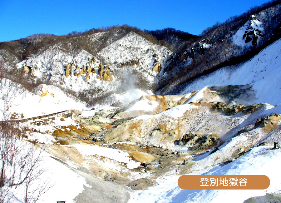 【登別地獄谷】是火山發後由融岩所形成的一個奇形詭異的谷地,灰白和褐色的岩層,加上許多地熱自地底噴出形成特殊的火山地形景觀,谷地上端為一直徑450公尺,面積611公頃的爆裂火山口,附近有地獄谷展望台,遊客可在台上觀看地獄谷奇景