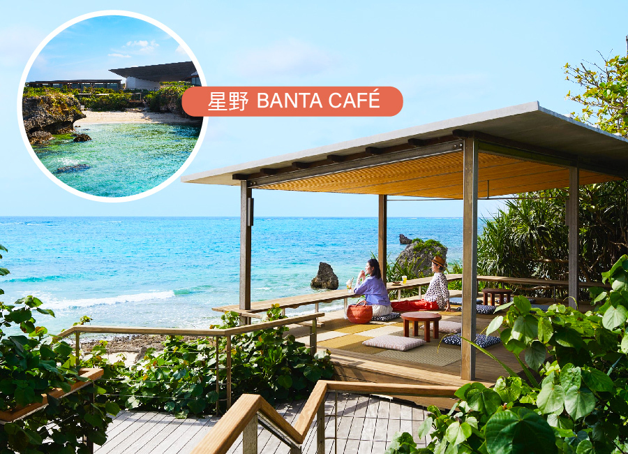【星野BANTA CAFÉ 】 利用自然地形營造出的非日常空間,是日本國內規模最大的海景咖 啡廳之一。珊瑚礁和大型岩層環繞的美麗海域。位於沖繩縣讀谷村的海岸線上,那裡 保留著豐富的自然風光。咖啡 館坐落在小海灣沿岸的高台上,可俯瞰地平線,。在宏偉的大自然所創造的非日常空間中,您可 以欣賞到難忘的風景。
