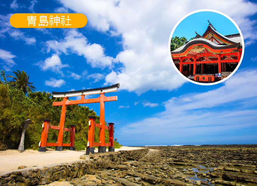 【青島神社】宮崎必訪能量景點,青島神社是日向神話「山幸彥與海幸彥」的故事舞台,主要供奉「山幸彥」(彦火火出見命)與他的妻子「豐玉姬命」,以及撮合2人的「鹽筒大神」。據說「山幸彥」弄丟了從哥哥「海幸彥」借來的魚鉤,正當祂愁眉苦臉之際,「鹽筒大神」建議祂到海裡尋找。「山幸彥」照著建議到海裡尋找,便與海神的女兒「豐玉姬」相遇結緣。日後神社因而成為祈求姻緣、安產、遠行及交通安全的能量景點。來到青島神社,除了到朱紅色的本殿參拜,也不要錯過包括將五彩色紙掛在樹上許願、把陶器丟碎去除厄運等境內5大開運和祈福的景點!