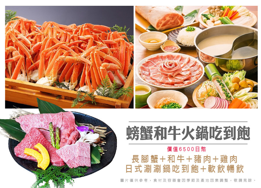 | 早餐:飯店內享用 | 午餐 :為方便遊玩 敬請自理 | 晚餐 :★特別安排~螃蟹&和牛&豬肉&季節蔬菜日式涮涮鍋吃到飽 +軟飲暢飲¥6500 |