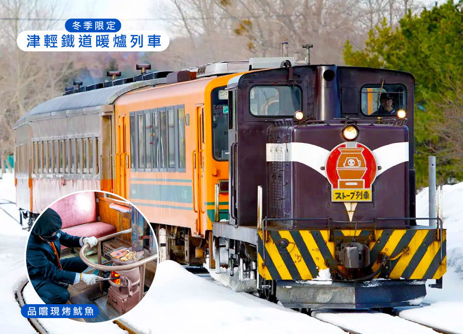 【津輕暖爐列車(品嚐現烤魷魚) 】進入雪國的冬季,設置炭爐的懷舊復古風暖氣列車便會行駛在白雪紛飛中的津輕平原間,列車中內配合著復古的氛圍中使用燃煤的暖爐,一邊欣賞著車窗外的銀白色世界,享受著特有的雪國風情。