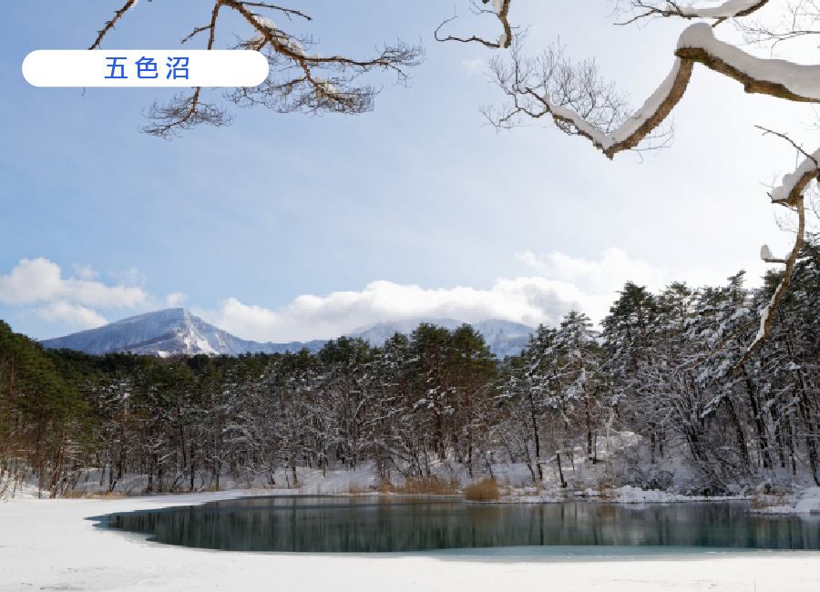 【五色沼】是盤梯山噴火所形成、20至30個沼澤的湖群總稱,湖水清麗秀美,顏色塊麗而富有變化,色彩有如渲染的畫一般,由翠綠、湛藍、深紫、咖啡等美麗的顏色交織而成,每個沼澤會有不同的顏色,路線兩旁全是天然原始的樹林,秋天時湖水的顏色和楓葉的紅,相映成趣,成為無與倫比的美麗景致。