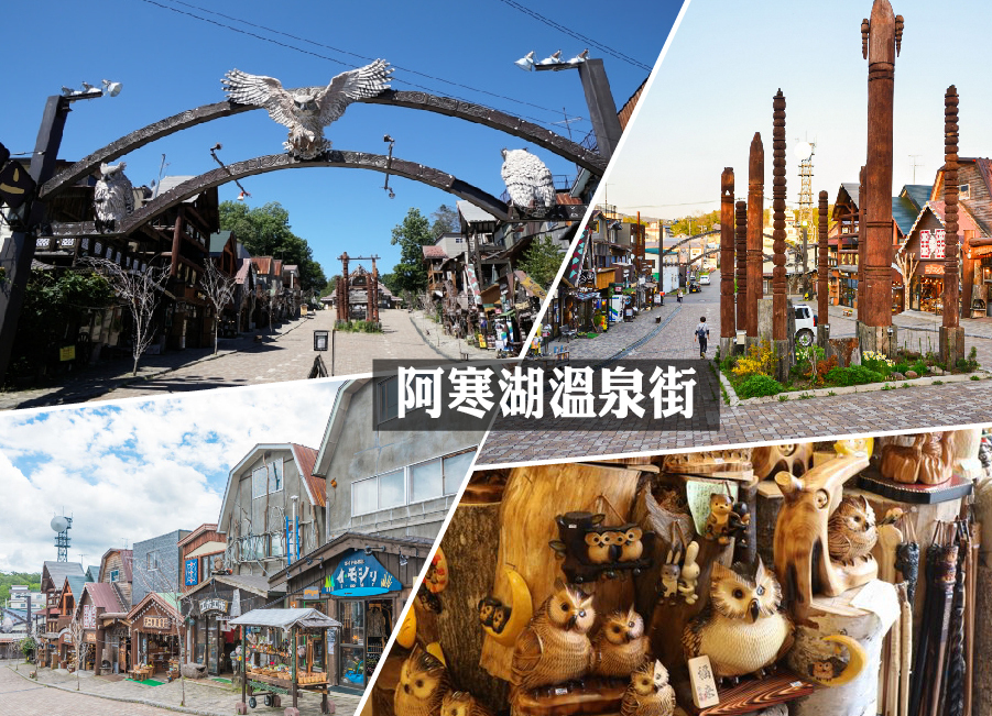 【阿寒湖溫泉街~愛努村落】有許多商店~愛努料理、綠球藻、紀念品、愛努的樂器-MUKKURI、木雕民藝品等。其獨特傳統文化、茅草屋的設計、及成排掛在桿子上曬鮭魚的畫面,都令人回味不已。 世界上獨一無二的丹頂鶴自然保育公園是在昭和45年,在前園長高橋先生的努力下, 成為世界上第一個將丹頂鶴以人工的方式孵化成功的保育園區。目前,在10公頃的園區內,放養了19隻的丹頂鶴幼鳥,到了5-6月,遊客們可能就可以看到他們走起路來搖搖晃晃、 令人憐惜的的樣子了。
